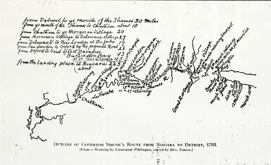 Drawn by Mrs. Simcoe — shows the Niagara to Detroit route with the Delaware village marked.