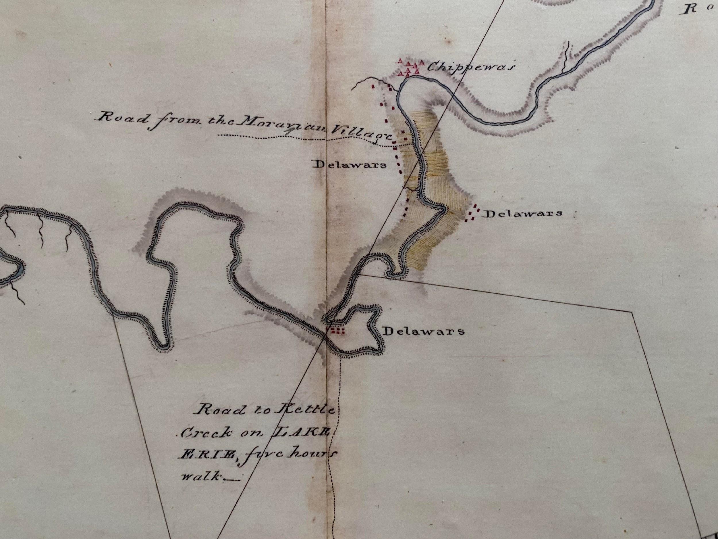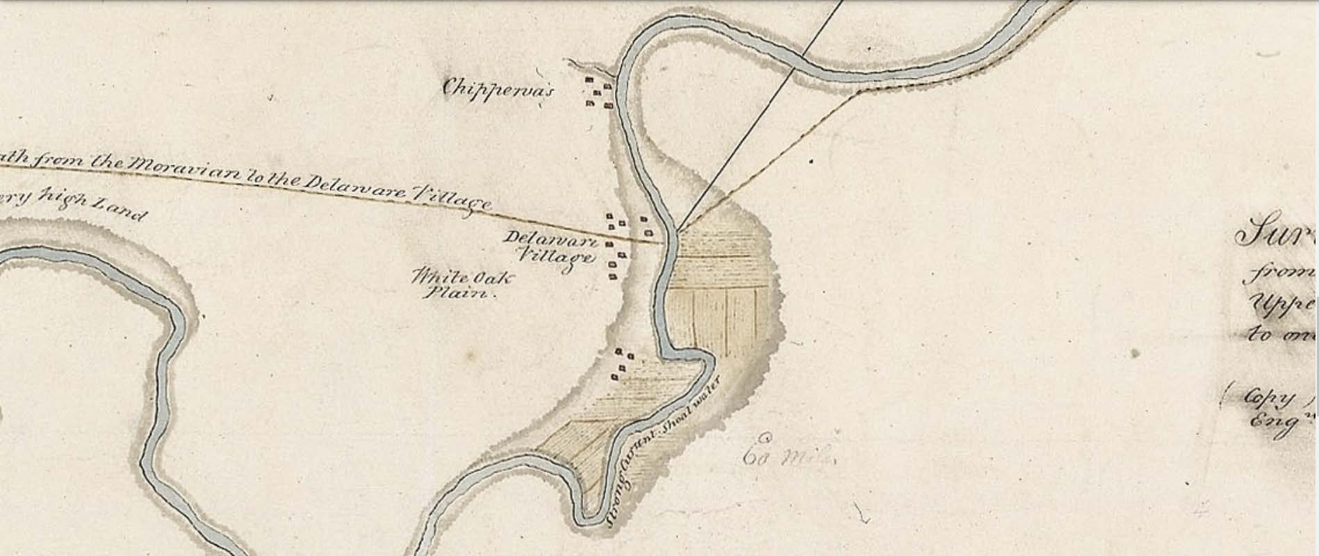 Three Munsee-Delaware villages, corn fields, and roads to the Moravian village and Kettle Creek.